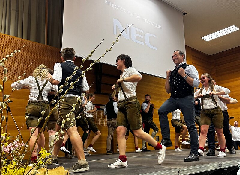 Doch neben den kulinarischen Gaumenfreuden aus der Region lockte bestimmt der Auftritt der “Lederhosenfeger” einige Gäste. Die weibliche Schuhplattler-Gruppe aus Eberstalzell zeigte mit traditionellen wie auch modernen Tänzen ihr Können. Zum “Watschn Plattler" holten sich die frechen Mädels prompt Unterstützung aus dem Publikum. Ausgewählte Herren - von Bürgermeister über Raiffeisenbank-Direktor zu Landjugend-Leiter und mehr honorige Persönlichkeiten - durften nach einem kurzen “Crash-Kurs” ihre tänzerischen Schrittfolgen zeigen. Es versteht sich von selbst: “Watschn auszuteilen" war den Damen vorbehalten!