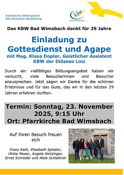 Das KBW-Team sagt "DANKE" für 29 Jahre vielfältiges Bildungsangebot, welches es gestalten durfte. Mit einem Gottesdienst und anschießender Agape werden schöne Erlebnisse noch einmal aufgezeigt.