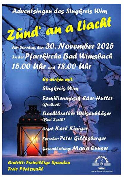 Unter der Leitung von Maria Ennser lädt der "Singkreis Wim" mit weiteren Musiker:innen herzlich zum "Adventsingen" (15:00 und 18:00 Uhr) in die Pfarrkirche ein.